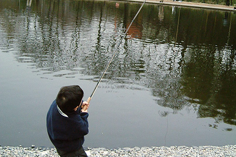 タックルの扱いは、まず陸上で慣れるとよい。釣り堀や管理釣り場にもよく行きましたが、混んだ管理釣り場は小さな子どもにはかなり危ないです