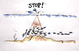 さて、停船しているボート上で見た魚探の魚群反応はどのように出るのでしょうか。いま、自船が大きな岩場上でピタリと止まっている場合を考えてみましょう。
