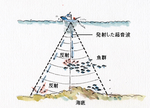 魚探は水中へ超音波を発射することにより、その反射波をとらえることで、魚群の存在や水深、分布状況、海底の様子などを知ることができる漁労用電子機器です。「やまびこ」などもそうですが、発射した音波や超音波が進んでゆく途中、何か物体(魚群や海底)に当たると反射し、その一部分は元のところへ返ってきます。魚探はこの超音波の反射する原理を応用しています。