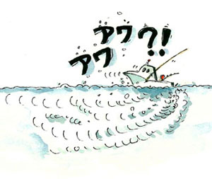 魚探は気泡(アワ)が大敵です。船底から発射された超音波は、海底に向かって真直ぐ進んで行きますが、その伝播途中にアワの層などがあるとその幕で反射されてしまい、そこから下方へ進むことができません。超音波はアワが苦手です。せっかく大きなパワーの超音波を発射しても、アワの幕で反射されたりその層の内部で大きく減衰してしまいます。この場合、超音波はアワの幕からの強い反射波のみとなり、水中深くの魚群や海底からの反射信号をとらえることができません。これがアワ切れ現象です。泡がみともいいます。