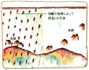 近場に他船がいる場合は、他船の魚探による干渉を受けることがあります。画面上に斜線が入ったり、点々状のノイズが入り、画像は見づらくなります。